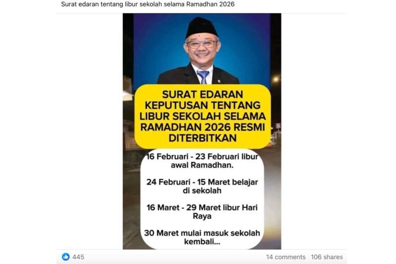 Unggahan tersebut mencantumkan jadwal libur awal Ramadan pada 16–23 Februari 2026, diikuti masa belajar 24 Februari–15 Maret, libur Hari Raya 16–29 Maret, dan masuk sekolah kembali pada 30 Maret 2026. Namun klaim itu belum didukung oleh surat edaran resmi dari instansi terkait.