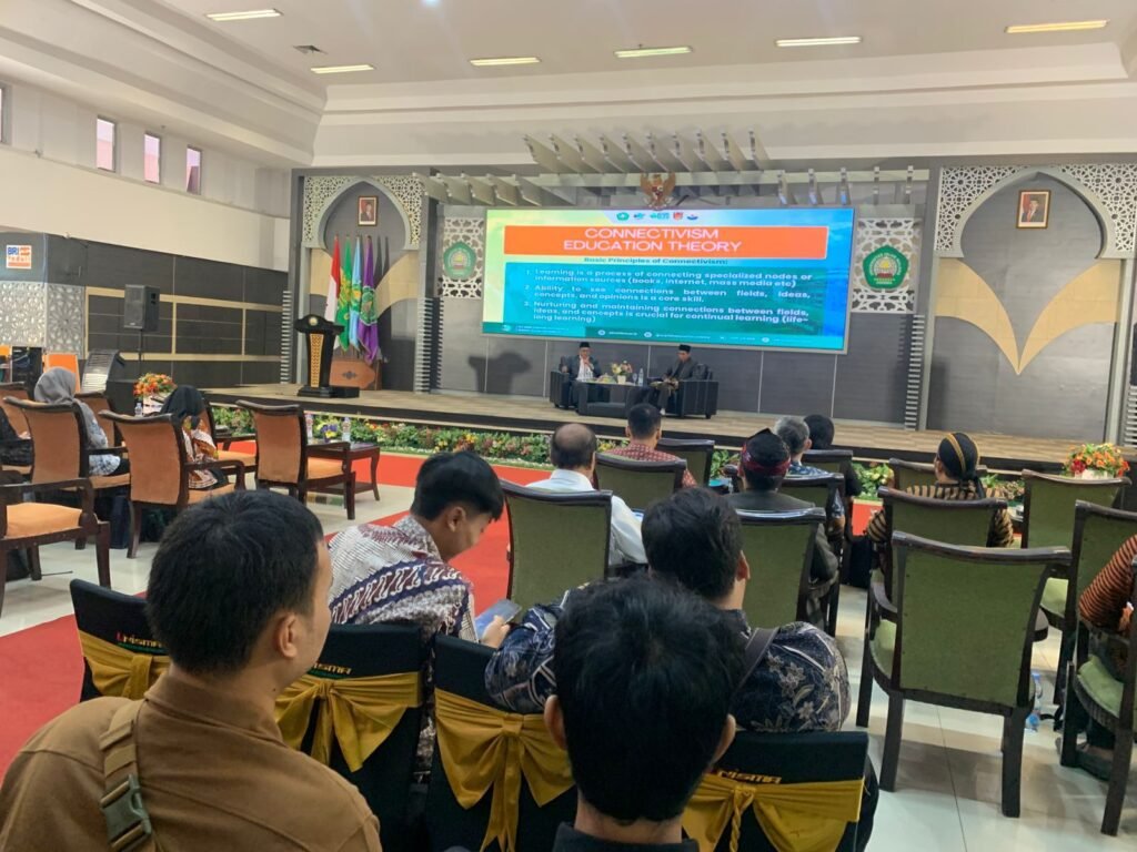 Teori tersebut menekankan tiga prinsip: pembelajaran sebagai proses menghubungkan berbagai sumber informasi, kemampuan melihat koneksi antar bidang sebagai keterampilan inti, serta pentingnya menjaga hubungan informasi untuk pembelajaran sepanjang hayat. Visual prinsip-prinsip ini ditampilkan di layar utama sebagai dasar diskusi akademik selama konferensi.