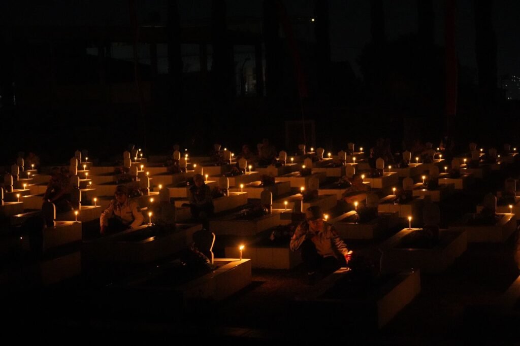 CITILIVE, BATU – Kapolres Batu AKBP Andi Yudha Pranata memimpin langsung Apel Kehormatan dan Renungan Suci dalam rangka memperingati Hari Ulang Tahun (HUT) ke-80 Kemerdekaan Republik Indonesia di Taman Makam Pahlawan (TMP) Suropati, Kelurahan Ngaglik, Kota Batu, Minggu (17/8/2025) pukul 00.00 WIB.Upacara digelar penuh khidmat dan sakral, ditandai dengan prosesi pemadaman lampu, penyalaan obor dan lilin sebagai bentuk penghormatan kepada para pahlawan.