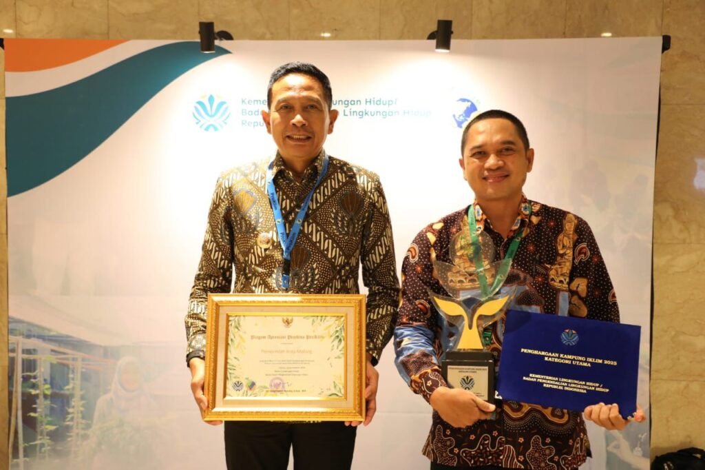 CITILIVE — Kota Malang meraih dua penghargaan pada Program Kampung Iklim (ProKlim) 2025 yang digelar Kementerian Lingkungan Hidup dan Kehutanan (KLHK) di Hotel Grand Sahid, Jakarta, Senin (1/12/2025). Apresiasi diberikan kepada Wali Kota Malang Wahyu Hidayat sebagai Pembina ProKlim, serta kepada Komunitas ProKlim RW 02 Kelurahan Arjosari.