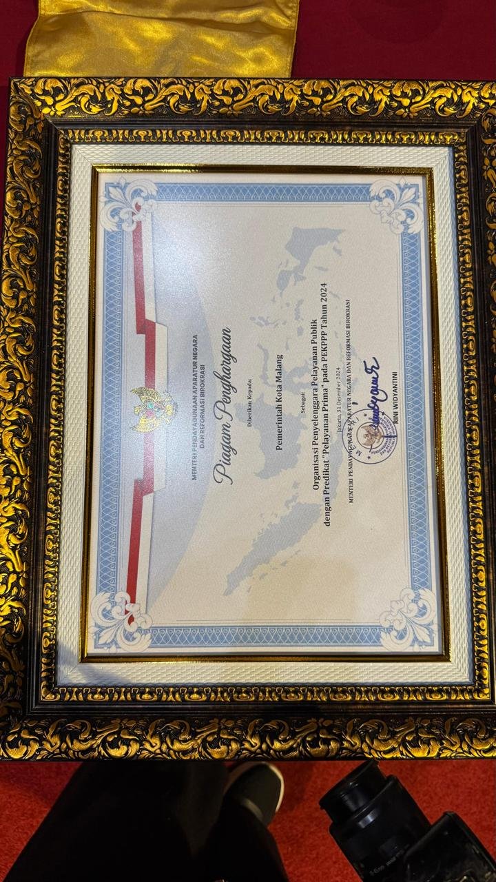Penghargaan diserahkan langsung oleh Deputi Bidang Pelayanan Publik KemenPANRB, Otok Kuswandaru, kepada Asisten Pemerintahan dan Kesejahteraan Rakyat Setda Kota Malang, Ida Ayu Made Wahyuni, di Jakarta, Senin (20/5/2025).