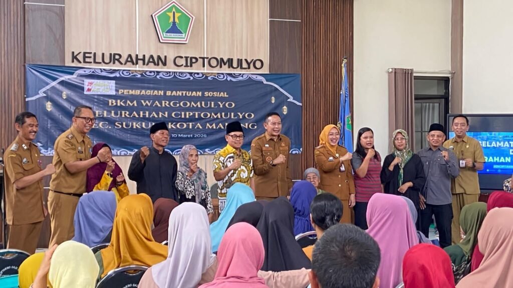CITILIVE,MALANG – Wali Kota Wahyu Hidayat menyerahkan secara simbolis bantuan 165 paket sembako kepada warga dhuafa di Aula Kelurahan Ciptomulyo, Kecamatan Sukun, Selasa (10/3/2026). Bantuan tersebut merupakan program sosial dari Badan Keswadayaan Masyarakat (BKM) yang rutin digelar setiap tahun untuk membantu masyarakat kurang mampu.