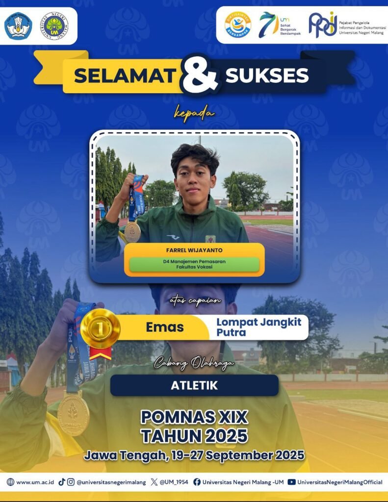 SMARTLIVE – Universitas Negeri Malang (UM) kembali mengukuhkan diri sebagai kampus pencetak prestasi setelah para mahasiswanya berhasil meraih sejumlah medali dalam ajang Pekan Olahraga Mahasiswa Nasional (POMNAS) XIX 2025 yang berlangsung di Semarang, Jawa Tengah, pada 19–27 September 2025.