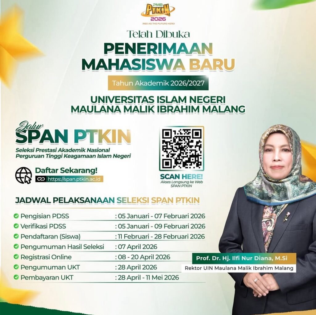 SMARTLIVE,MALANG — Universitas Islam Negeri (UIN) Maulana Malik Ibrahim Malang resmi membuka Penerimaan Mahasiswa Baru (PMB) Tahun Akademik 2026/2027 melalui jalur Seleksi Prestasi Akademik Nasional Perguruan Tinggi Keagamaan Islam Negeri (SPAN PTKIN). Jalur ini diperuntukkan bagi siswa berprestasi di tingkat SMA/MA/SMK sederajat tanpa tes tertulis.